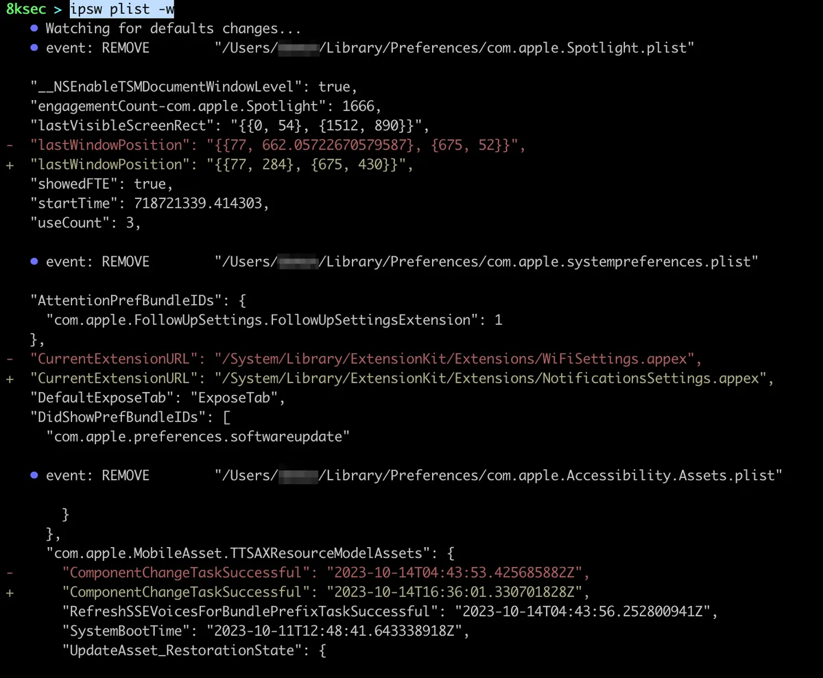 We can also use ipsw plist to watch specific directory for changes inside of plist files. This comes in handy when we want to track what changes inside of plist file while we are working with the application.
