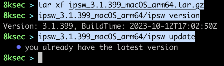 After the download has finished, we can extract the archive, check our version and to see if we are indeed running the latest version by running ipsw update inside of downloaded package.