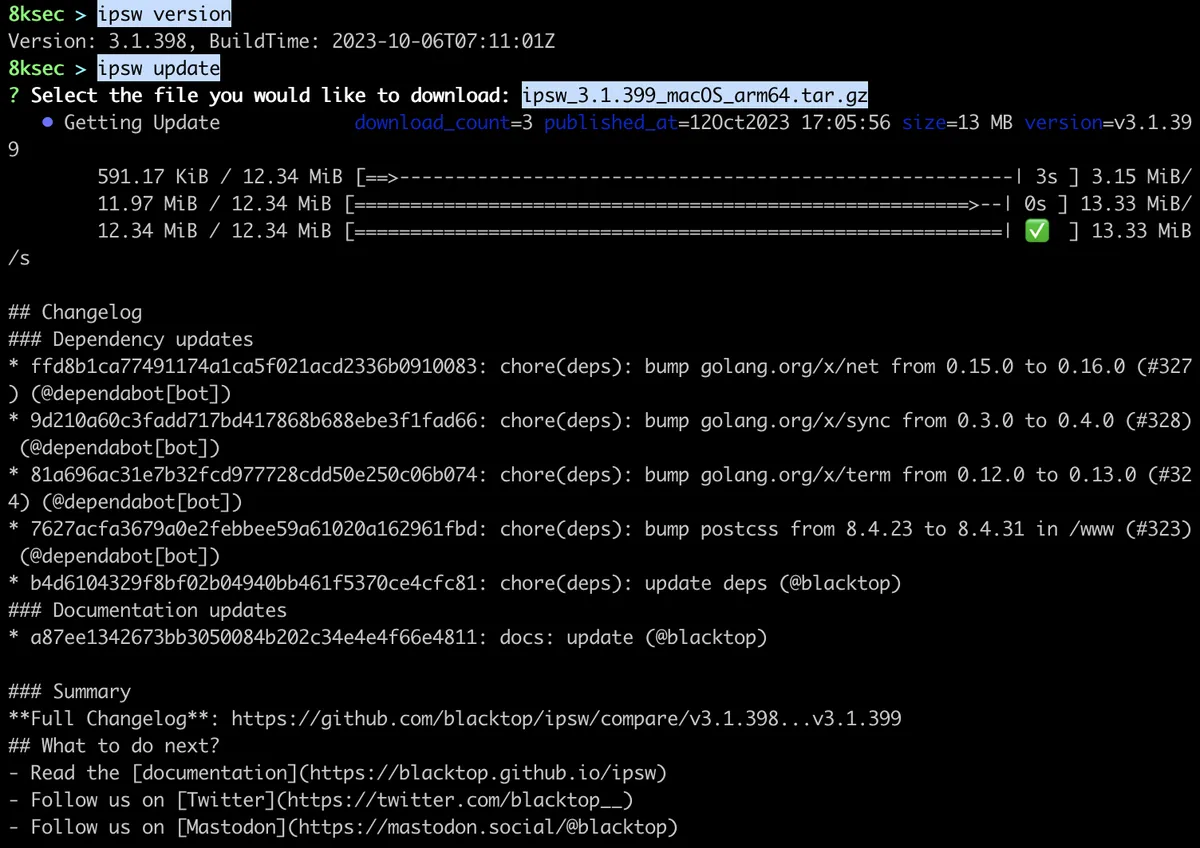 ipsw provides us with the convenient way to update it by running the ipsw update which then allows us to download the new version for out specific OS and architecture.