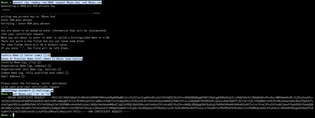 command: openssl req -newkey rsa:2048 -keyout 8ksec.key -out 8ksec.csr