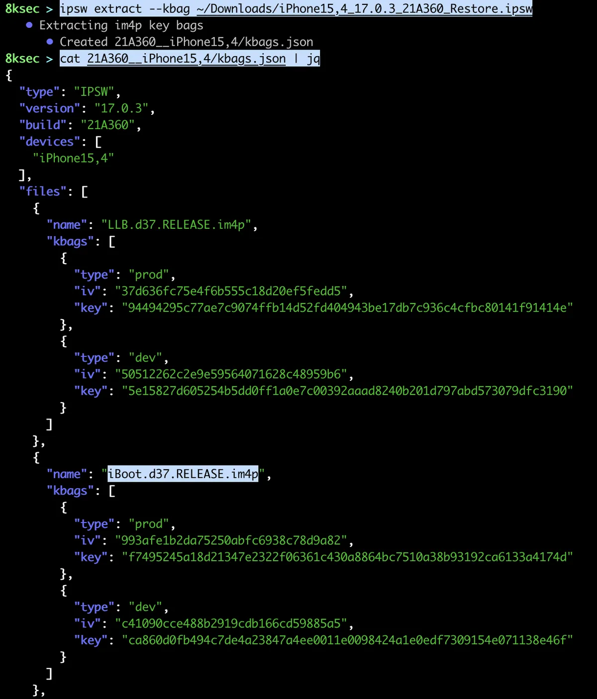 Another useful feature is dumping im4p keybags as json file. im4p file is a payload of IMG4 file format which is used for iBoot, ramdisk etc for 64 bit devices.