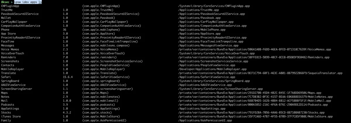 command_to_list_apps: ipsw idev apps ls