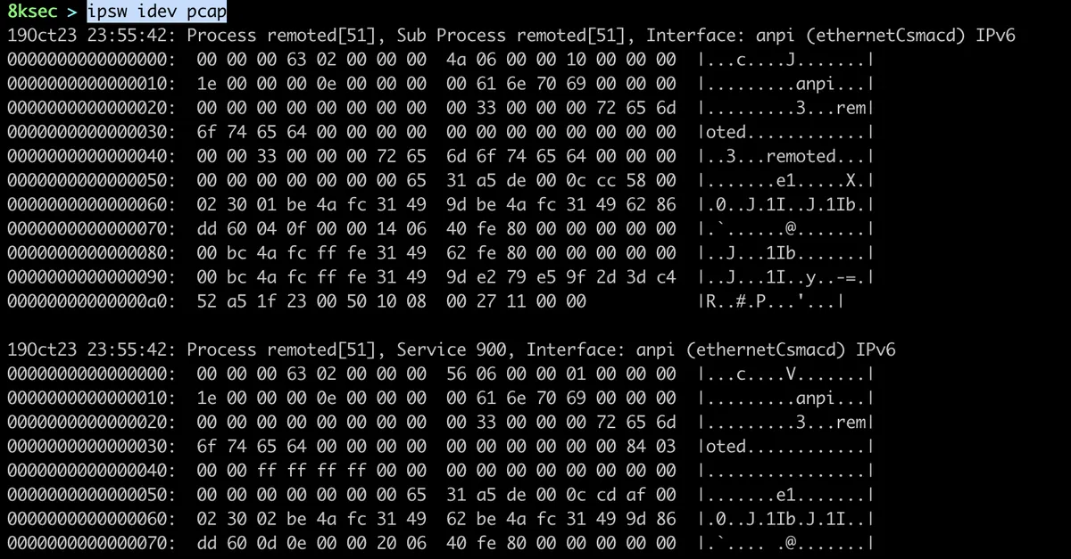 command: ipsw idev pcap OPTIONAL_FLAGS