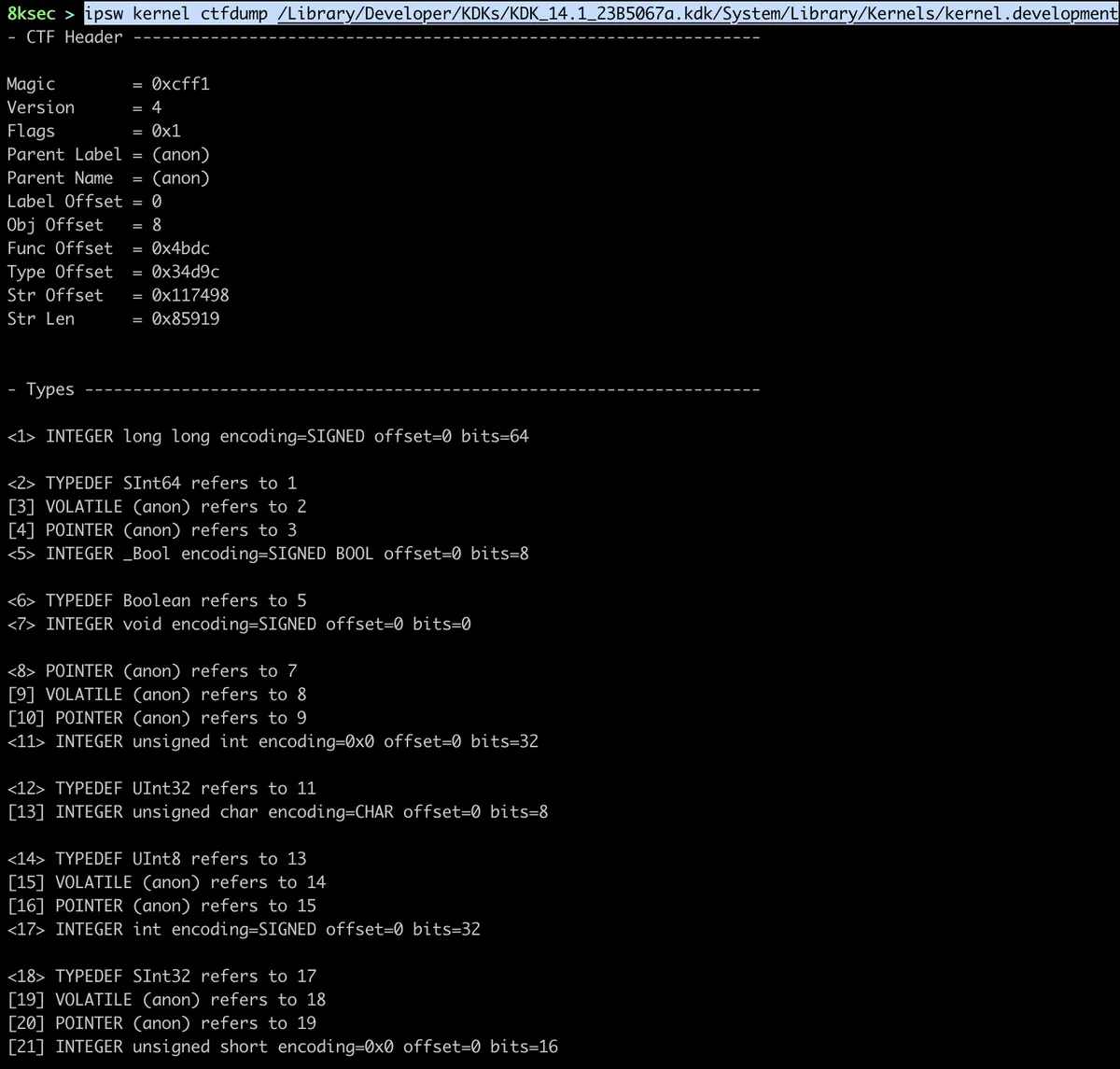 ipsw kernel ctfdump allows us to view CTF (Compact ANSI-C Type Format) format which is similar to DWARF format and contains a lot of useful information for reverse engineering. It is worth to note that only KDK (Kernel Development Kit) contains these information.