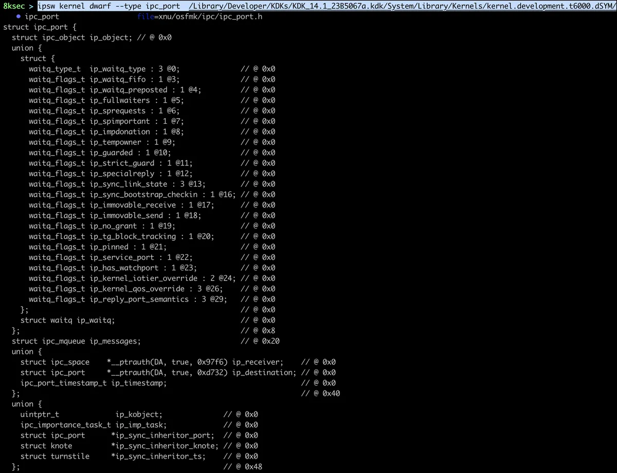 ipsw kernel dwarf allows us to view DWARF debug information. We need to pass it the type to lookup or we can do diff on types or two kernels.