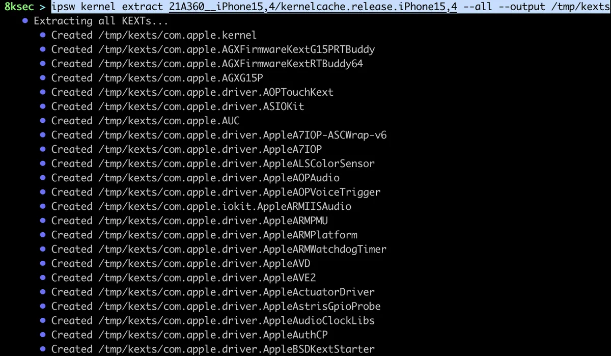 We will start with the ipsw extract command which allows us to extract kernelcache, dyld_shared_cache, DeviceTree and Im4p keybags from IPSW/OTA files.