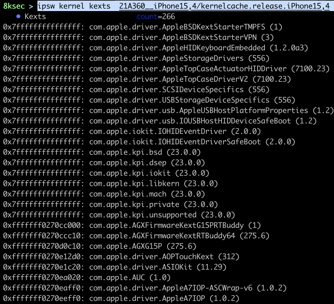 command: ipsw kernel kexts PATH_TO_KERNEL