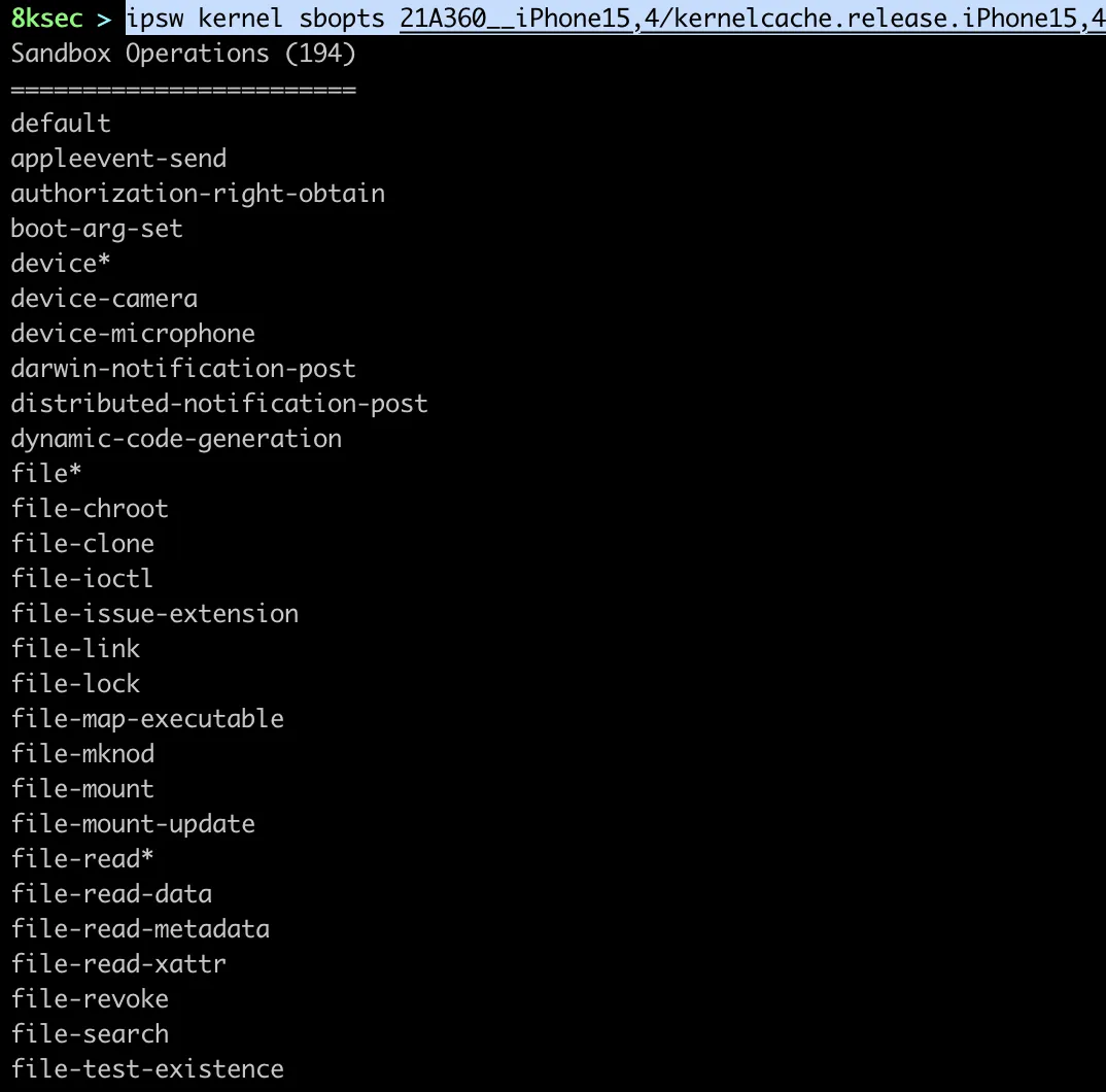 We can view sandbox operations using ipsw kernel sbopts.
