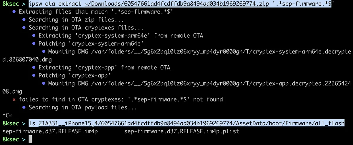 Once we have obtained the key from the keybags we can now decrypt the im4p file, but before doing that, we can also extract payloads using ipsw img4 extract.