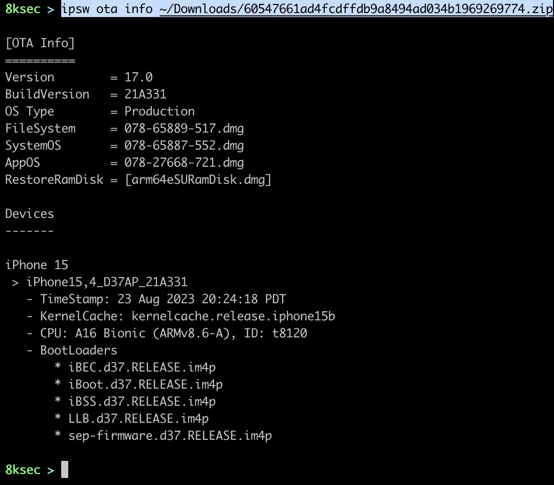 ipsw ota info returns as a basic information about the OTA file, such as version, kernelcache, CPU, etc.