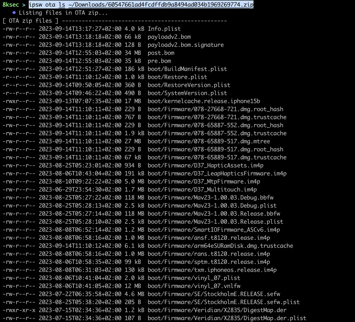 We can view all the files inside of OTA file using ipsw ota ls.