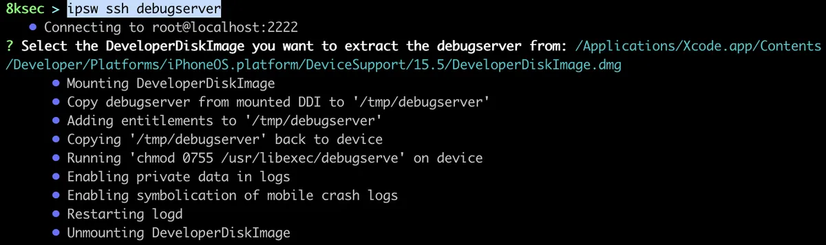 command: ipsw ssh debugserver