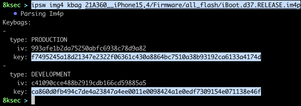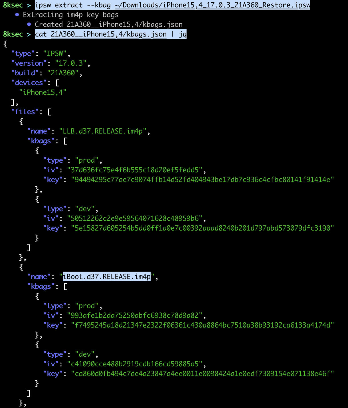 Another useful feature is dumping im4p keybags as json file. im4p file is a payload of IMG4 file format which is used for iBoot, ramdisk etc for 64 bit devices.