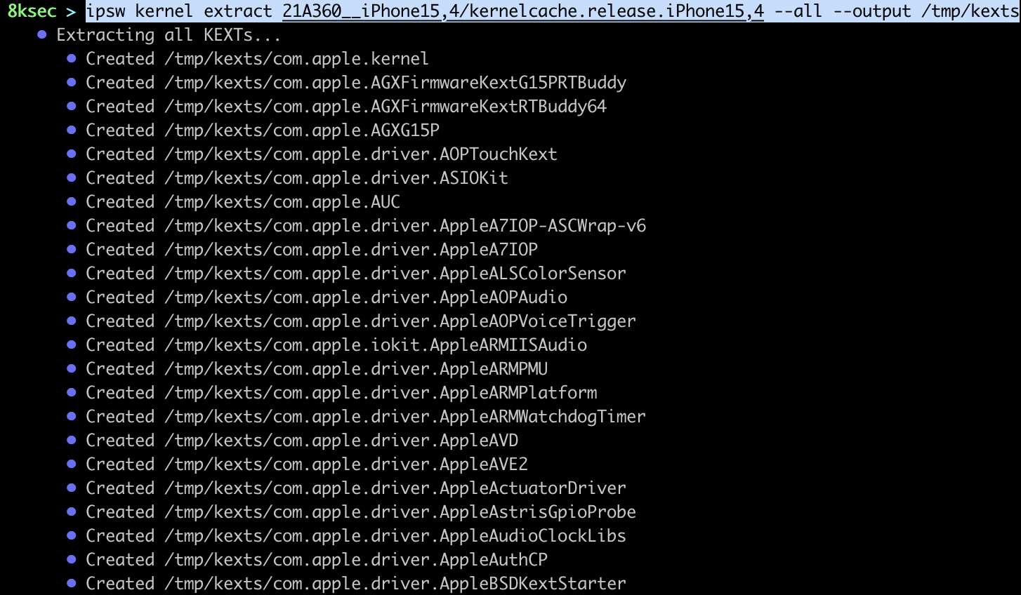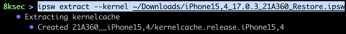 We will start with the ipsw extract command which allows us to extract kernelcache, dyld_shared_cache, DeviceTree and Im4p keybags from IPSW/OTA files.