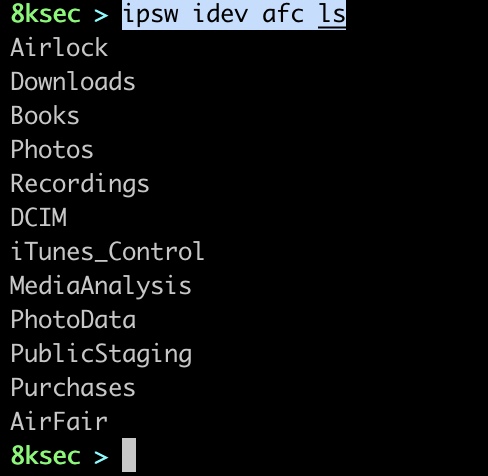 The first ipsw idev subcommand is afc which provides a couple of filesystem commands which allows us to manipulate files and directories inside of /var/mobile/Media on the device.