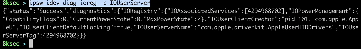 ipsw idev diag provides us with the couple of diagnostics commands, such as getting snapshot of battery data, querying IORegistry, shutting down, rebooting and putting the device to sleep.