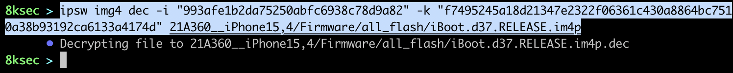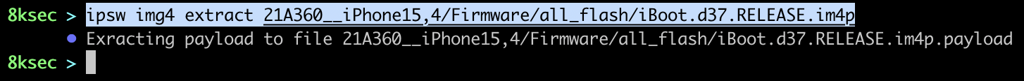 Once we have obtained the key from the keybags we can now decrypt the im4p file, but before doing that, we can also extract payloads using ipsw img4 extract.