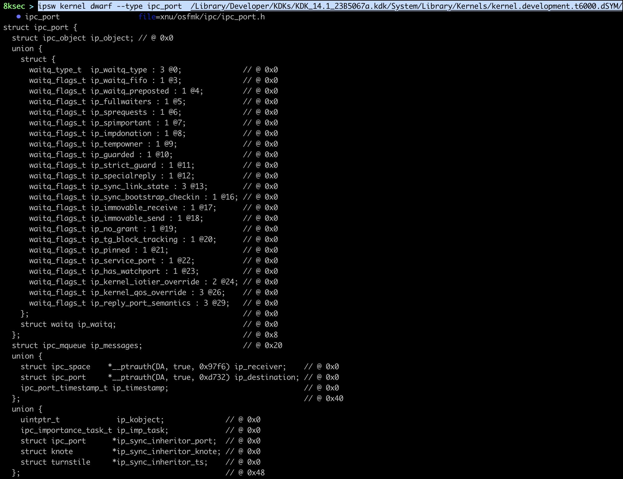 command: ipsw kernel dwarf --type TYPE_TO_LOOKUP PATH_TO_DSYM