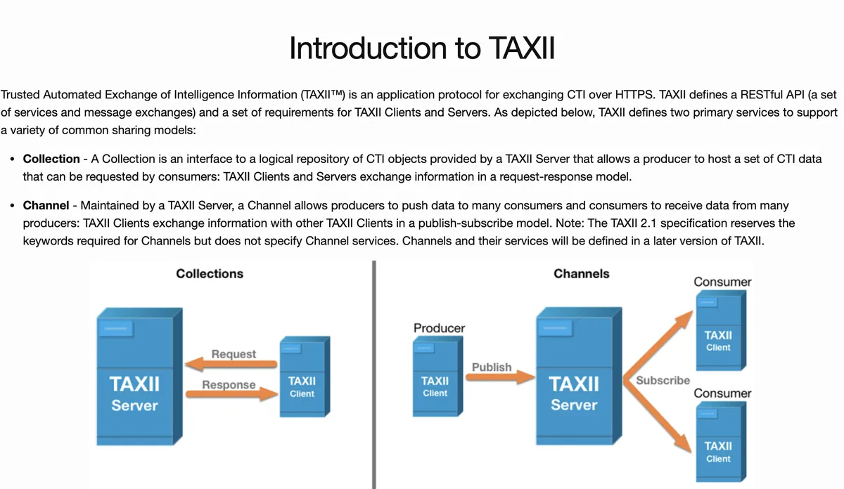 Main two concepts in TAXII are the collection and the channel. A collection is a set of STIX packages organised and managed by the single entity, such as a security vendor or a government agency. A channel allows organizations to access a specific collection, such as through API, file exchange, or threat intelligence platform. A channel allows user to push data to multiple consumers.