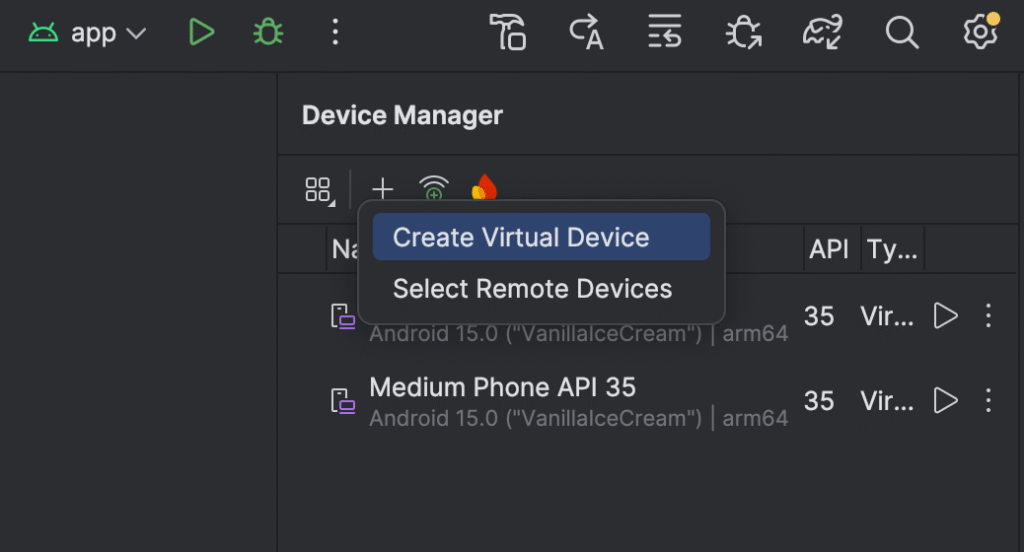 In our case, we chose API 35 with Google Play. Download the image if needed and finish creating the AVD. In our case we’ll save this AVD device with the name as targetdevice1.