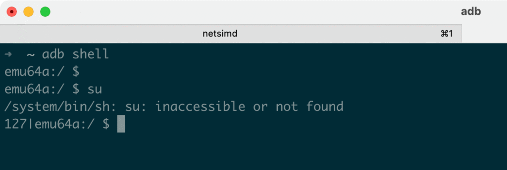 Since the emulator is not rooted at this point, running su should result in an error or “not found” message as shown in the following screenshot: