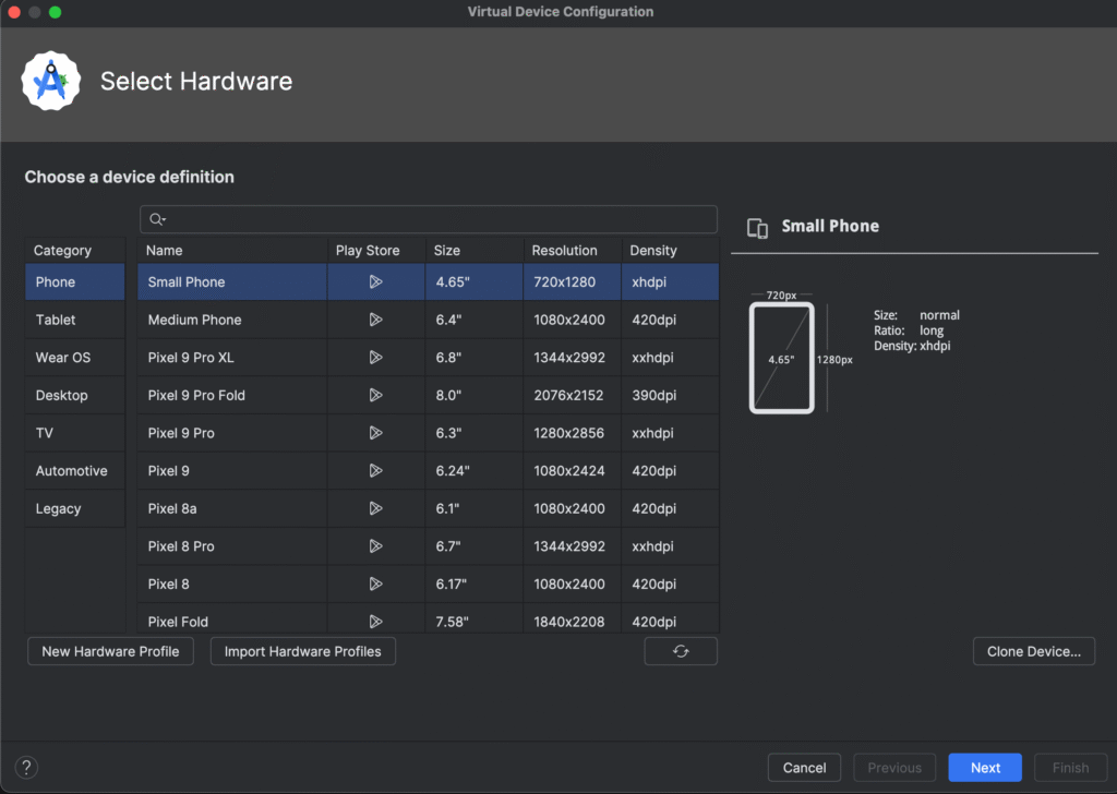Click Create Device and select a device profile. In our case we’ll choose the “Small Phone” but feel free to choose any of the other skins you might want from the provided list.