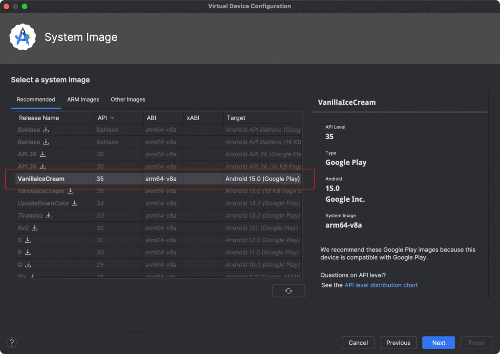 In the system image selection, choose an Android 15 (API 35) image. As shown in the screenshot below, choose an image with Google APIs or Google Play Services support so that apps requiring Google Play will run.