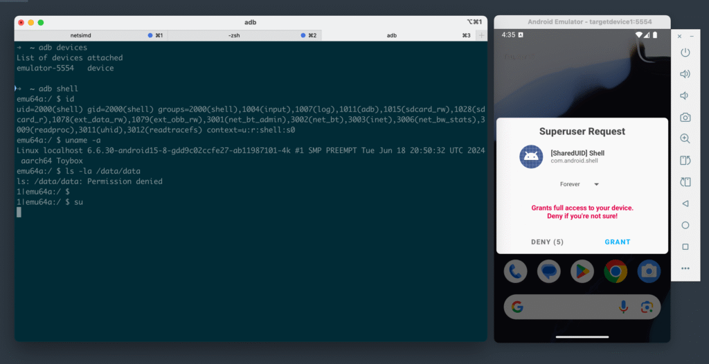 Keep in mind that while our emulator now behaves like a rooted device, you should still be aware of differences between emulators and real hardware like timing, sensors, etc when conducting your tests. Nonetheless, this setup is a huge boon for mobile security researchers and Android developers focused on security.